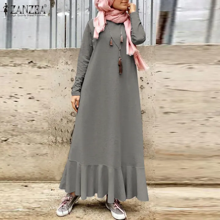 Zanzea Muslimah Wanita Kasual Musim Musim Sejuk Muslim Dubai Kaftan Dikait Ruffles Tunic Panjang Baju Pakaian Lazada
